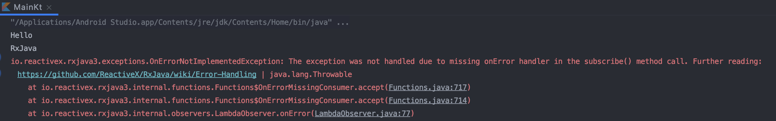 // Observable이 에러를 전달할 때 호출. Error시 Complete없이 종료다.